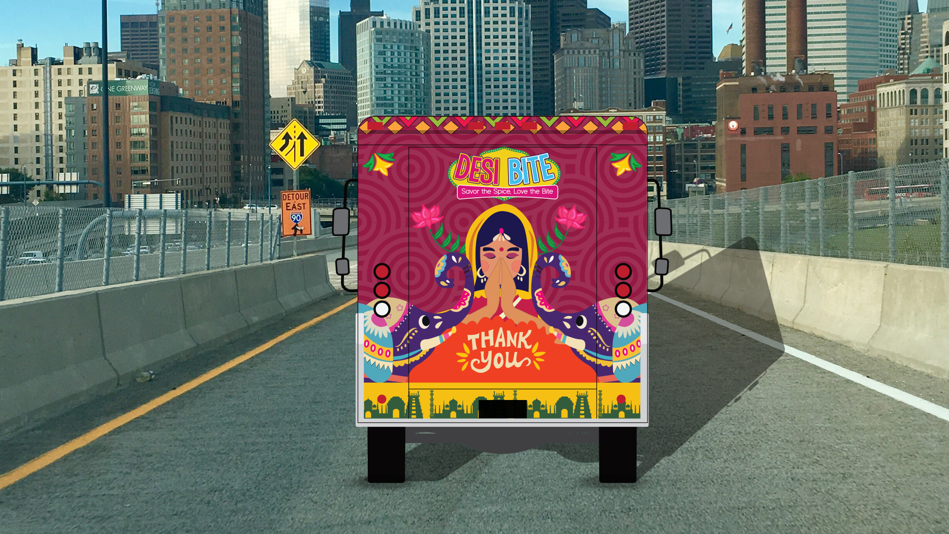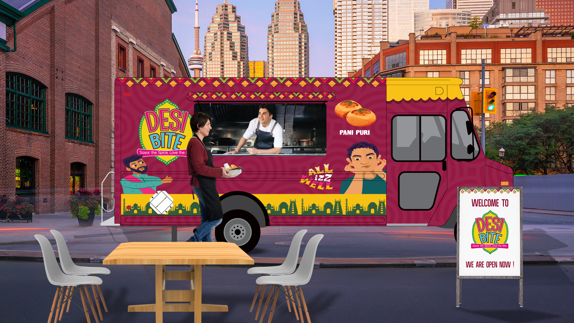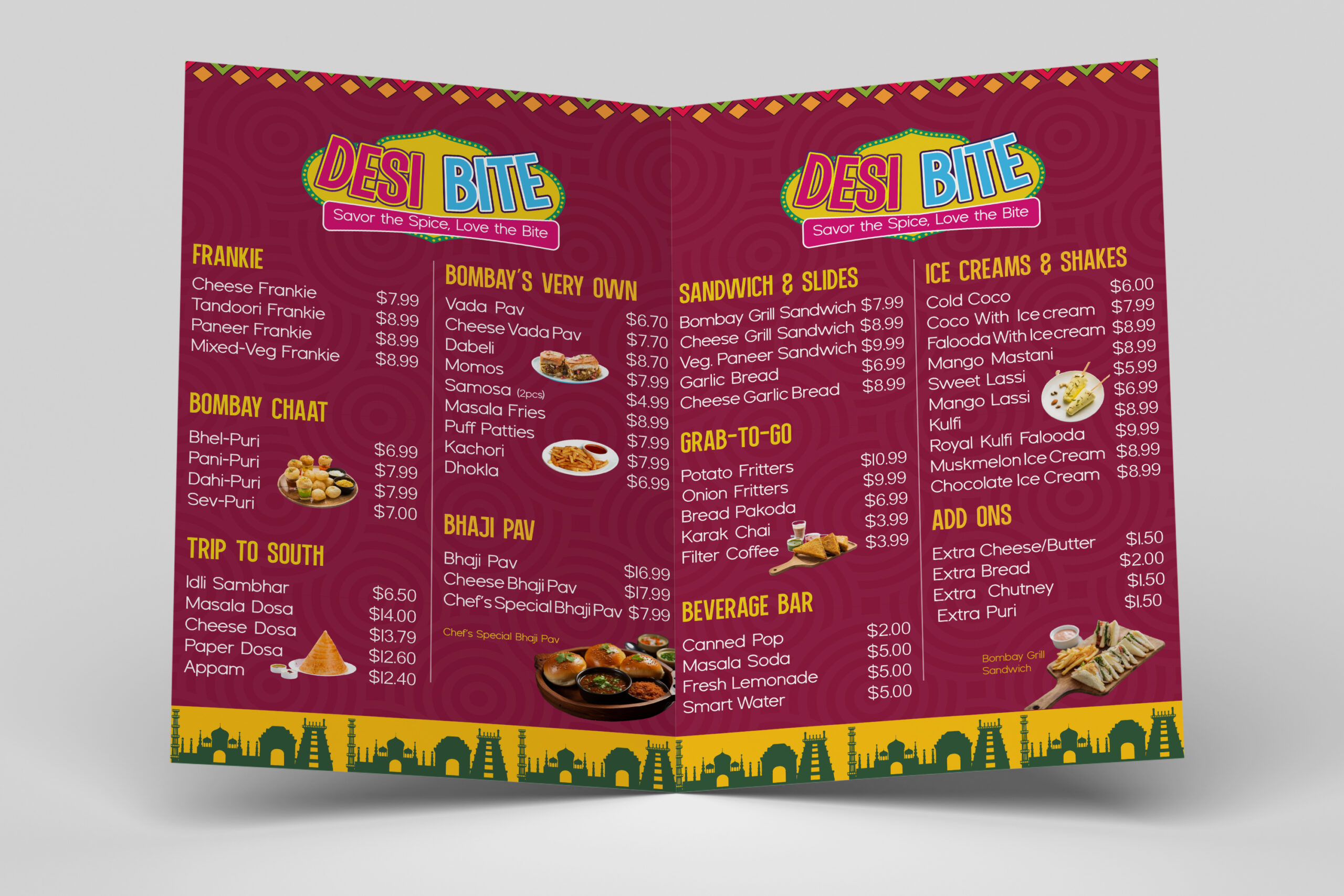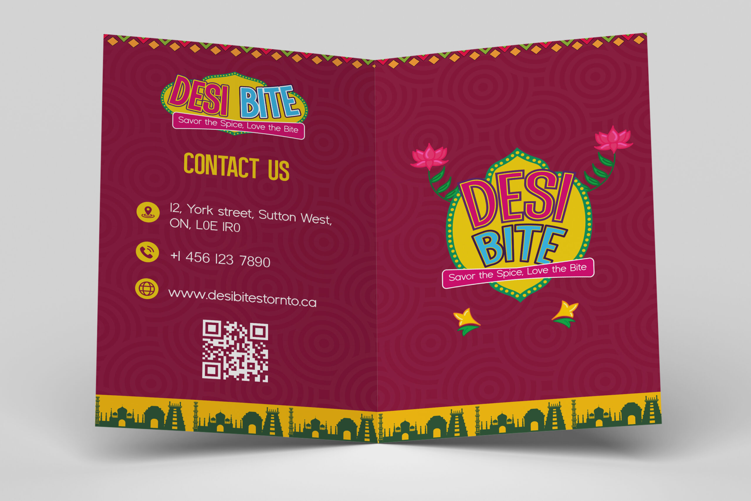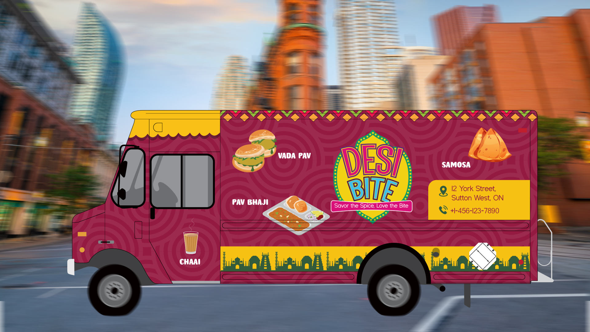 Desi Bites is anĀ Indian Food truckĀ in Canada that combines vivid branding that honors India's rich culture with the flavors of real street cuisine. A visually captivating identity is produced by combining elaborate patterns, handwritten typography, and a vibrant color scheme inspired by traditional marketplaces. Desi-inspired themes are used into the food truck's design, menu design, and overall appearance to create a nostalgic yet contemporary experience.