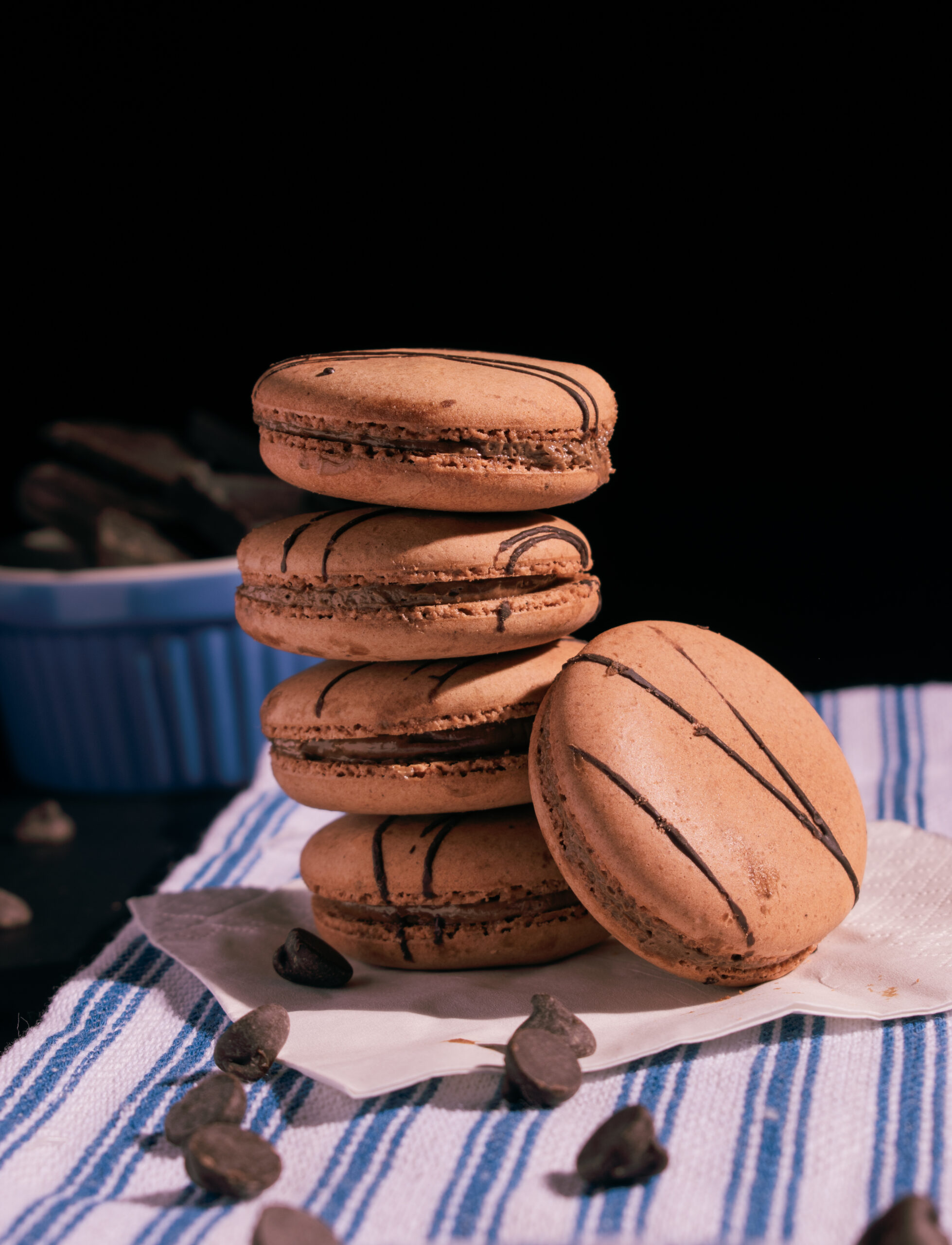 A stack of chocolate macarons with chocolate drizzle sits on a striped cloth, surrounded by scattered chocolate chips. The black background enhances the rich, warm tones of the macarons.